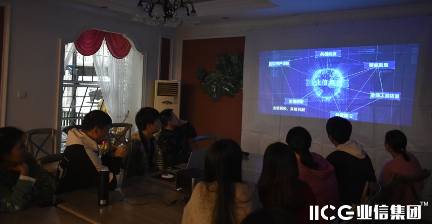 ▲全体与会人员观看了业信集团形象宣传片《助力登山—IICG业信集团》(2020年版)。