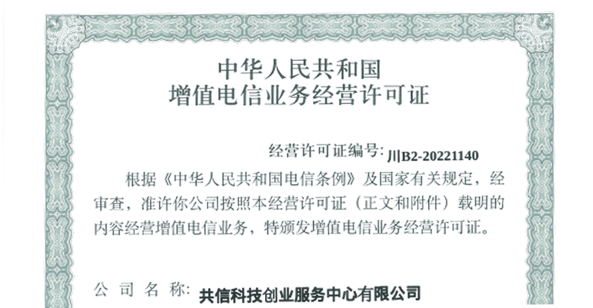 本网讯,据科服集团传来的消息,2022年8月底,集团旗下共信科技创业服务中心有限公司获得四川省通信管理局颁发的《中华人民共和国增值电信业务经营许可证》(经营许可证编号:川B2-20221140)。